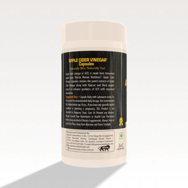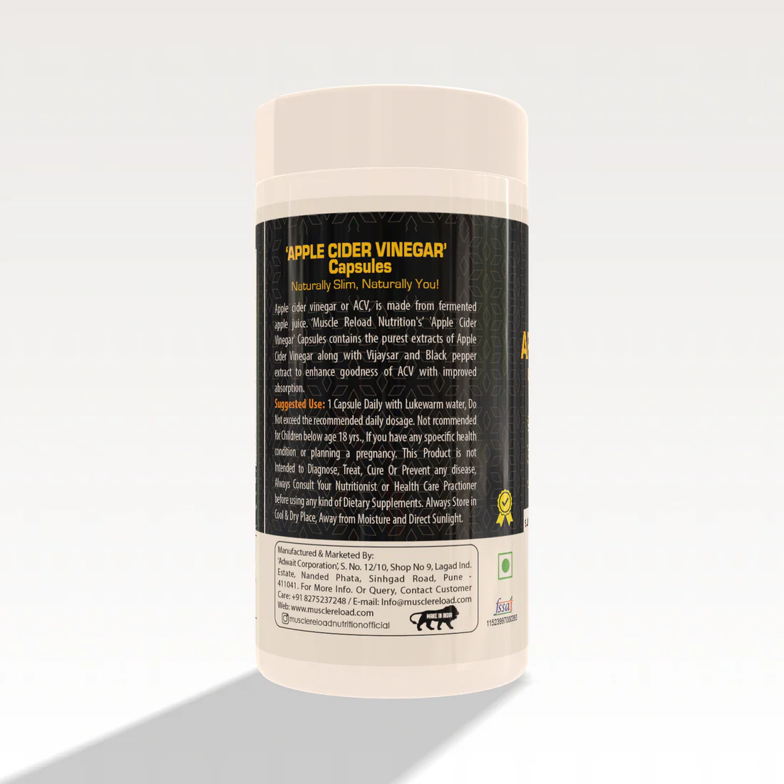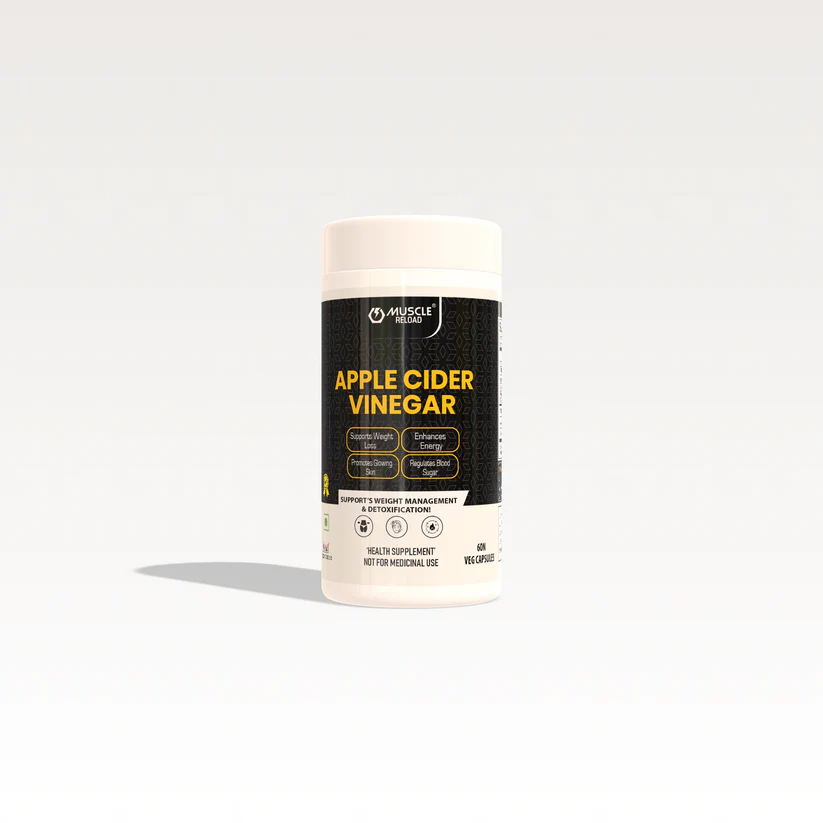 Boost your metabolism, detox naturally, and support energy levels with Muscle Reload Apple Cider Vinegar (ACV) Capsules. Formulated with 500mg ACV per capsule, enriched with Vijaysar and Black Pepper, this convenient plant-based supplement delivers the benefits of apple cider vinegar without the sour taste or liquid mess.