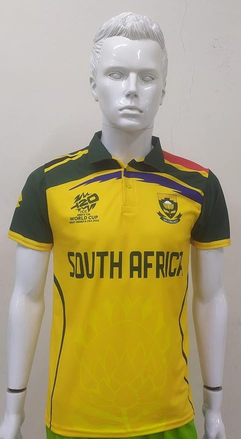 The product South Africa Cricket Team Jersey is a premium fabric replica of the South Africa cricket team’s ICC Men’s World Cup jersey for the 2023 event. Manufactured in India , this t-shirt is a must-have item for cricket fans looking to show their support for the team. With its authentic design and high-quality material, this jersey is perfect for wearing to matches or displaying as part of a collection of cricket memorabilia. Whether you’re a die-hard fan or simply appreciate the sport, this replica jersey is a fantastic piece for any cricket enthusiast.